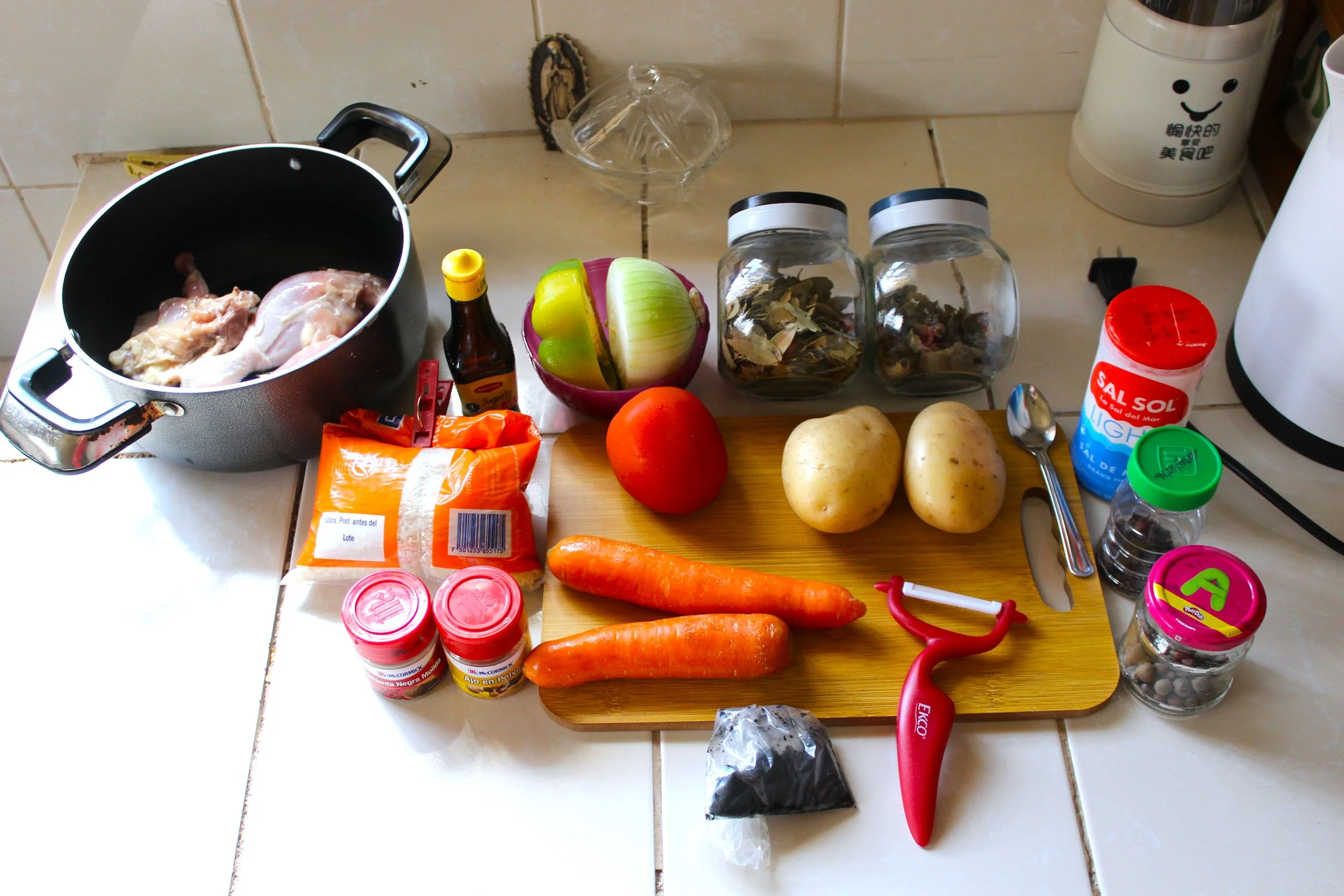 Chop the carrots, potatoes, tomato, bell pepper, and onion into small pieces. Set aside.